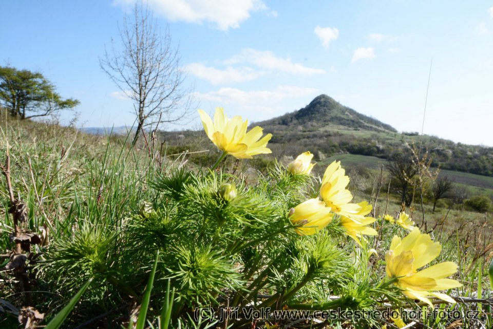 Kolonie hlaváčků na úpatí oblíku, v pozadí Srdov
