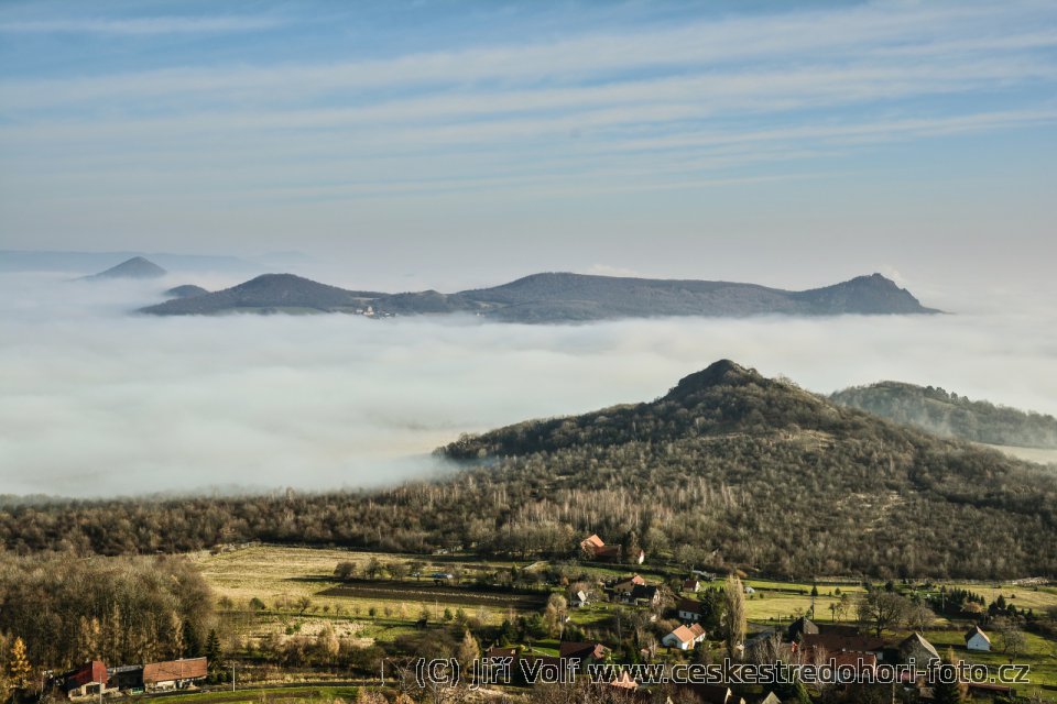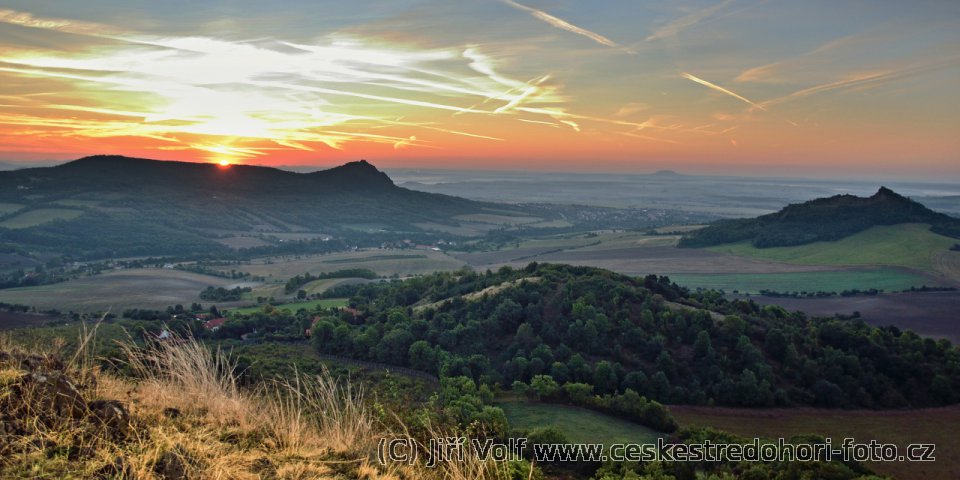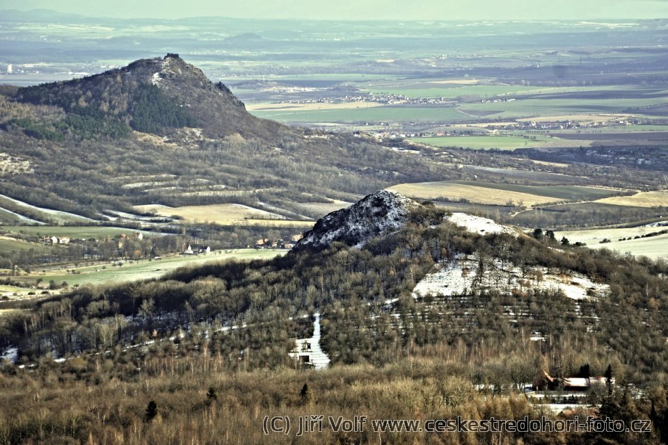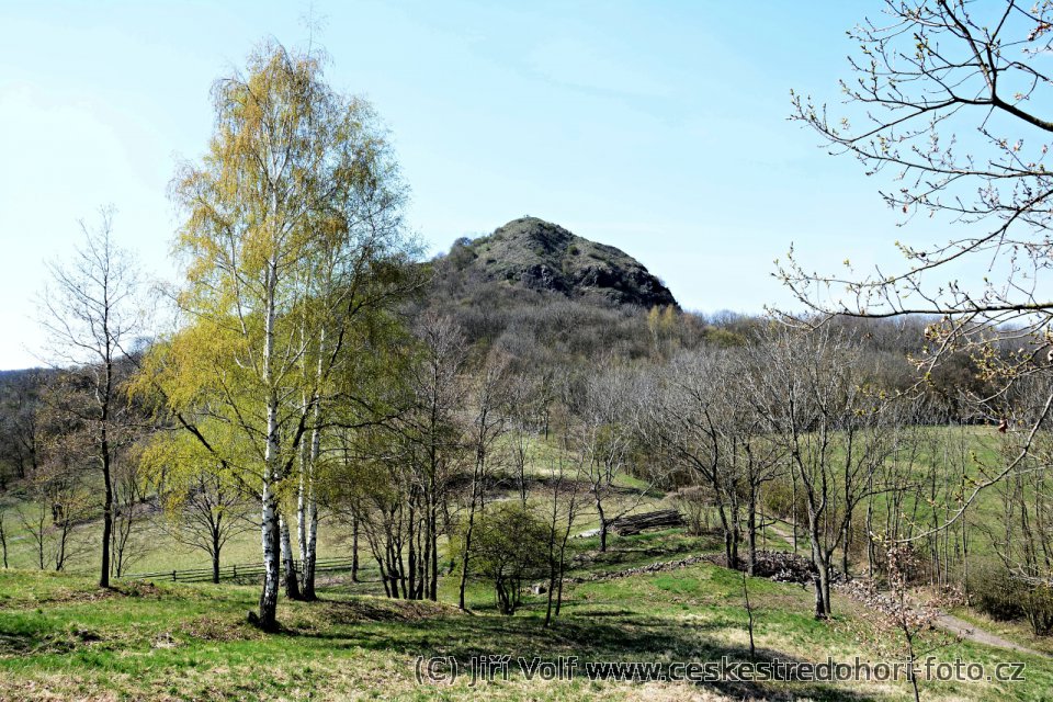 Pohled na Plešivec z Hrádku, v pozadí Košťálov